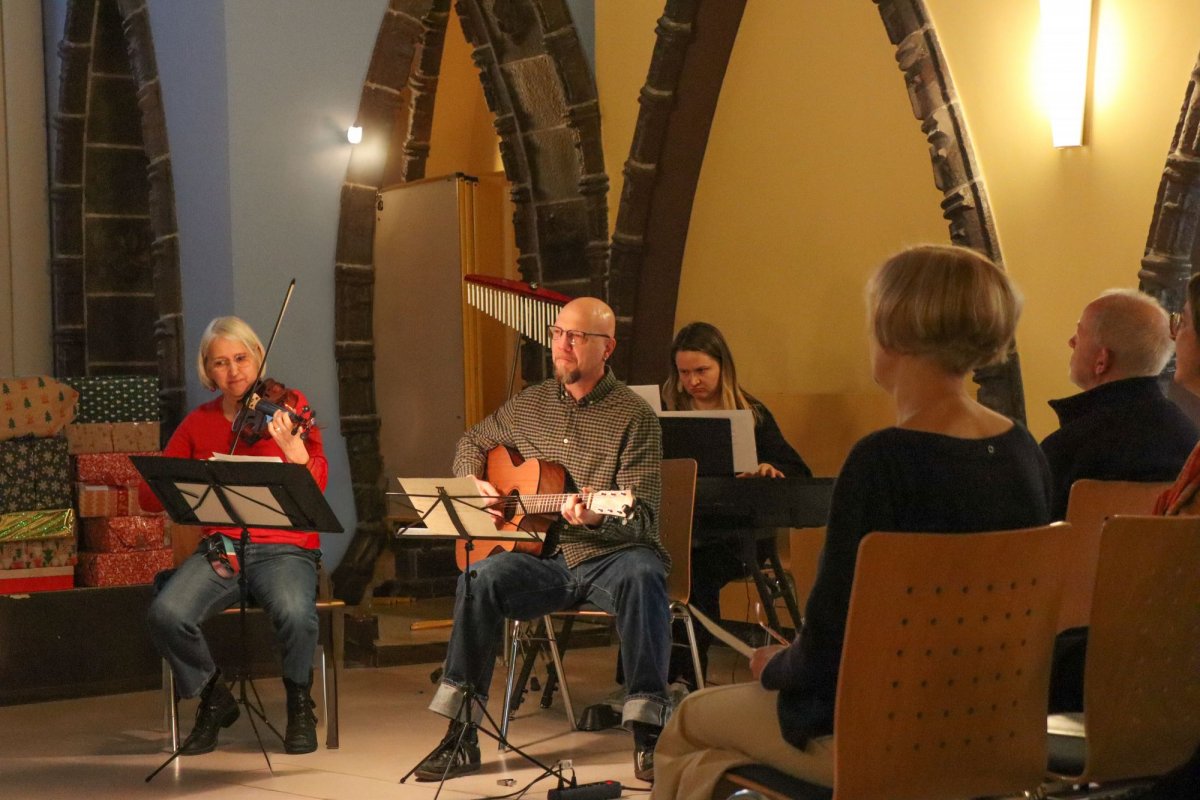 In der Aula haben wir am 18.12.25 schon unseren weihnachtlichen Gottesdienst gefeiert. Organisiert von einer Teilzeitklasse im zweiten Ausbildungsjahr, der TZ2b, stand das Fest unter dem Motto Dankbarkeit. Pater Krupa, der schon am alten Standort viele Gottesdienste mit uns gefeiert hat, bevor er für einige Zeit Berlin verlassen hat, ist wieder zurück und hielt die Predigt mit gewohnter Warmherzigkeit. Der Chor aus Studierenden und Lehrkräften wurde tatkräftig von Ursula Platzeck-Heiss dirigiert. Mit einem Klick auf "Weiterlesen" gibt es noch mehr Fotos und Eindrücke.